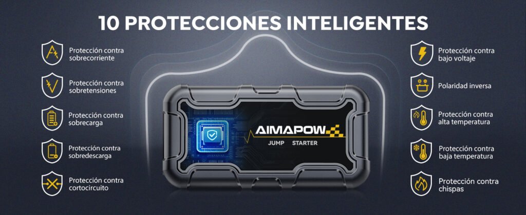 Además de su capacidad de arranque, el AIMAPOW A20 destaca por incorporar tecnología de seguridad avanzada y funciones prácticas como puertos de carga rápida USB-A y USB-C, permitiendo utilizarlo también como power bank de alta capacidad. Su diseño robusto y su facilidad de uso lo convierten en un compañero ideal tanto para el uso diario como para viajes largos, aportando tranquilidad en cada trayecto.