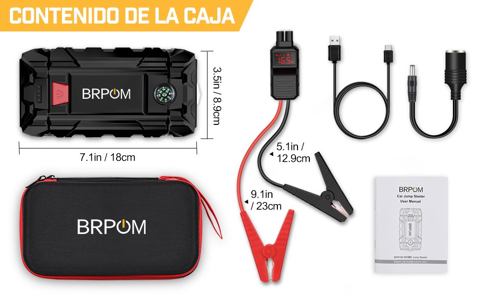 Al adquirir el BRPOM BM300, recibirás todo lo necesario para utilizar el arrancador desde el primer momento. El contenido viene presentado de forma organizada y listo para su uso inmediato: