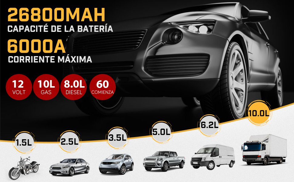 Con sus impresionantes 6000A de pico de corriente, este arrancador está preparado para enfrentarse a los motores más exigentes. Desde coches familiares hasta camiones o furgonetas diésel de gran cilindrada, ofrece una capacidad de arranque inmediata incluso con baterías completamente descargadas.