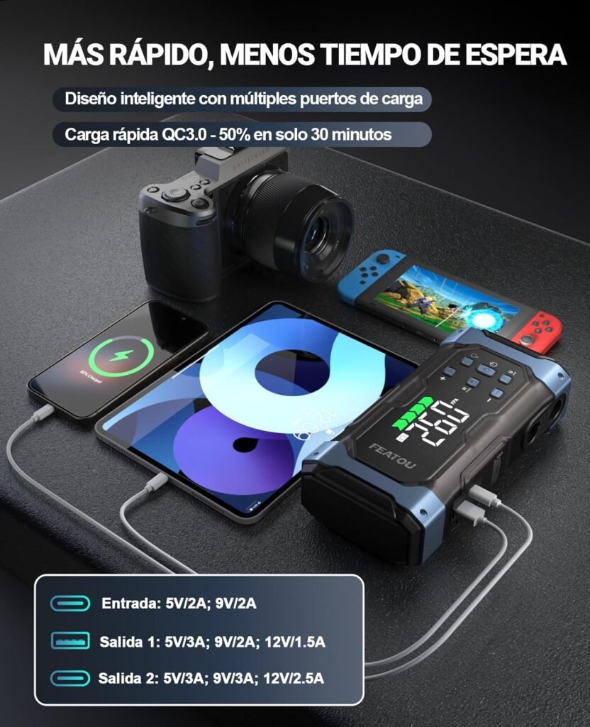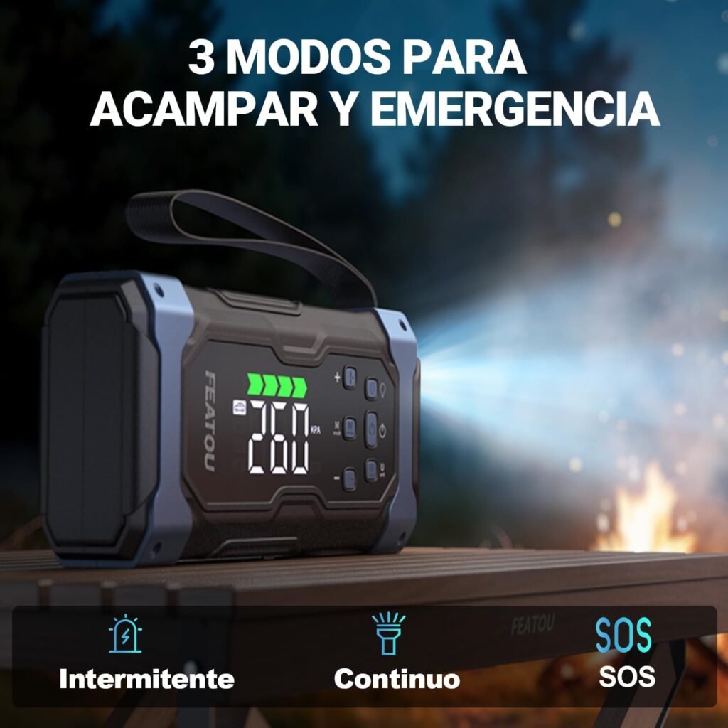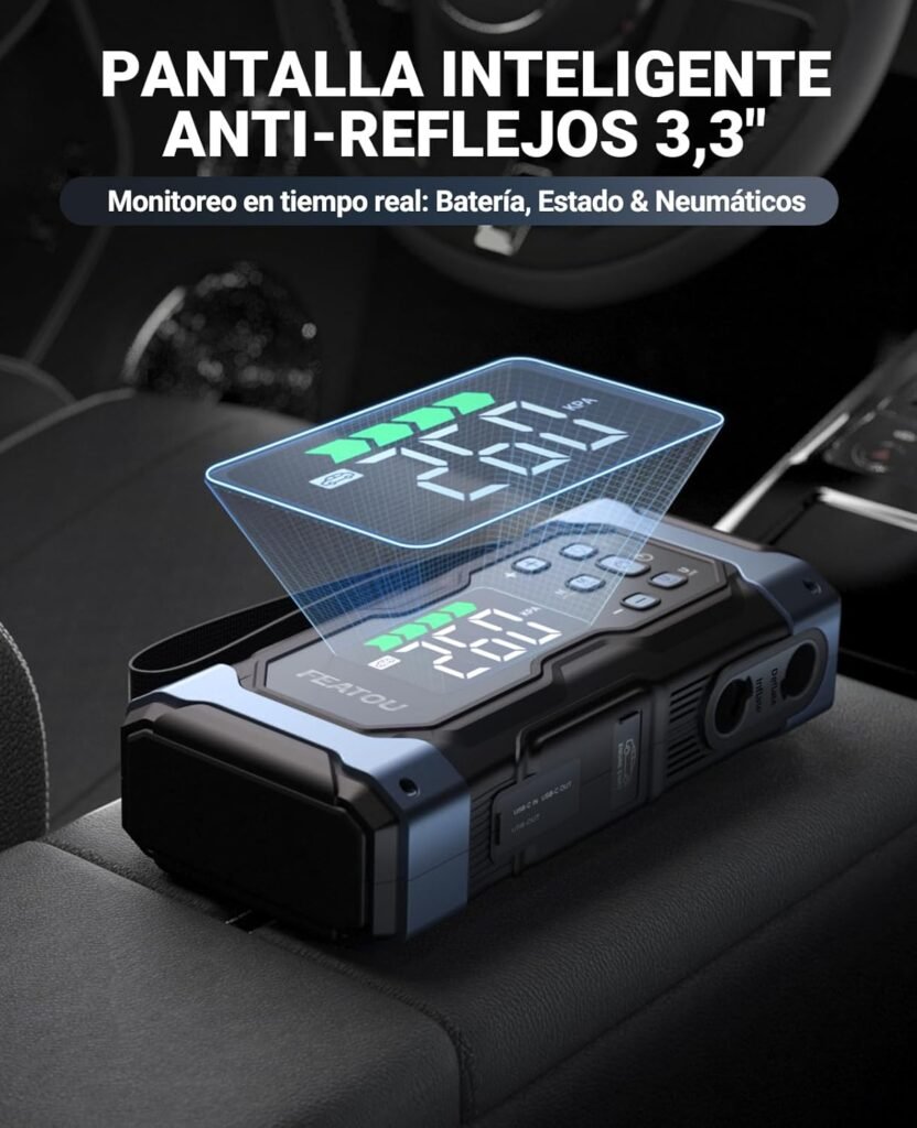 Pero lo que realmente distingue al FEATOU V8 de otros arrancadores es su compresor de aire digital incorporado, con el que podrás inflar neumáticos, balones o incluso colchones portátiles sin necesidad de accesorios adicionales. A esto se suma su batería de 20 000 mAh, que actúa como powerbank para cargar móviles, tablets o GPS, ofreciendo una fuente de energía portátil ideal para viajes largos o situaciones de emergencia.