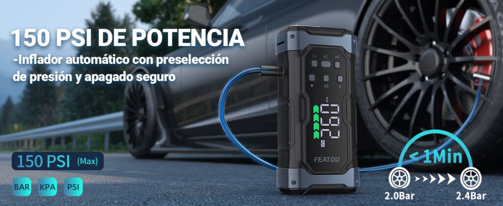 El FEATOU V8 se sitúa en la categoría de arrancadores portátiles de alto rendimiento y uso versátil. No es simplemente un modelo básico para arrancar de vez en cuando; está pensado para quienes necesitan una herramienta completa: arranque, inflado, recarga de dispositivos y asistencia en carretera.