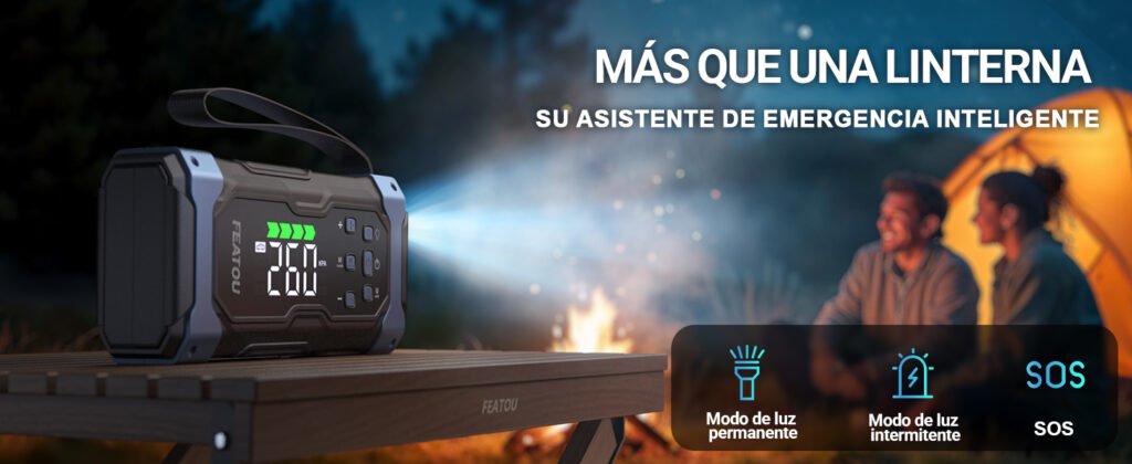 El FEATOU V8 incorpora una linterna LED de alta intensidad con varios modos: luz fija, intermitente y SOS. Resulta especialmente útil en emergencias nocturnas o para señalizar el vehículo cuando se realizan reparaciones en carretera.