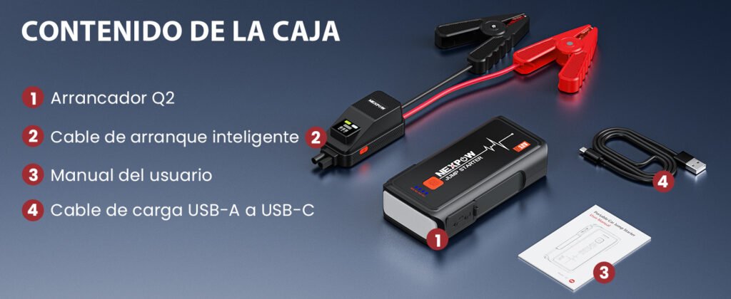 El NEXPOW Q2 viene listo para usar desde el primer momento, con todo lo necesario para afrontar cualquier emergencia de batería en carretera.