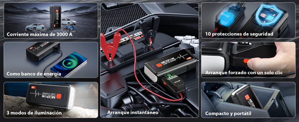 NEXPOW es una marca reconocida por ofrecer arrancadores de batería portátiles con buena potencia, diseño compacto y funciones adicionales pensadas para el día a día. Dentro de su catálogo, se pueden encontrar desde modelos básicos orientados a coches pequeños, hasta opciones más avanzadas con mayor capacidad de arranque y extras como compresor de aire o carga rápida.