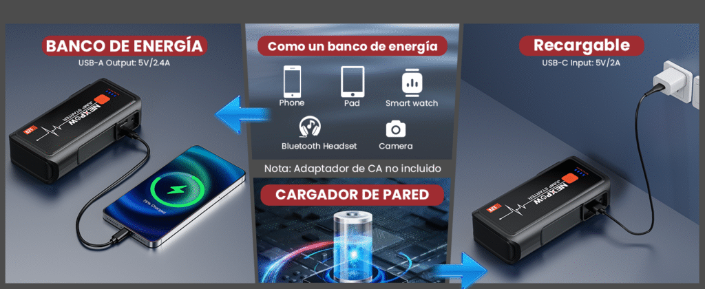 Su batería puede cargar móviles, tablets u otros dispositivos durante viajes o emergencias, sin necesidad de enchufes externos. - Linterna LED multifunción