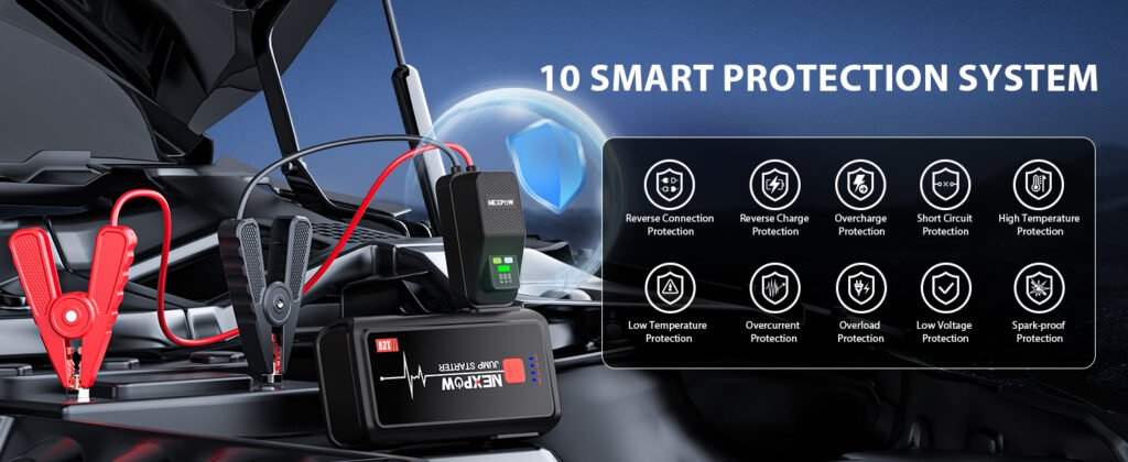 El NEXPOW Q2 incluye pinzas de arranque reforzadas, con un sistema de protección que evita cortocircuitos, inversión de polaridad, sobrecarga y otros errores comunes. Esto permite una experiencia de uso segura incluso para usuarios sin experiencia previa.