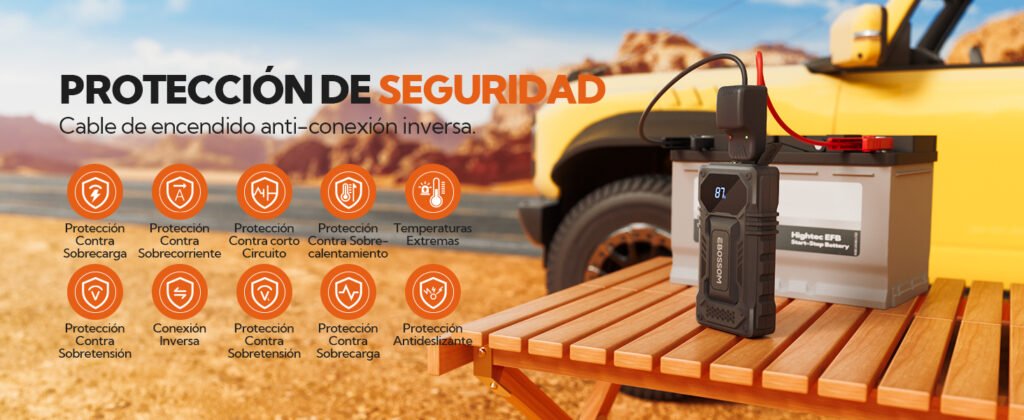El dispositivo incorpora múltiples protecciones electrónicas para evitar errores comunes, como polaridad inversa, cortocircuitos, sobrecorriente, sobrecalentamiento y tensión inestable. Estas características lo hacen especialmente adecuado para usuarios sin experiencia con arrancadores de batería.