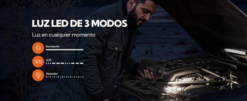 La linterna integrada facilita trabajar en la oscuridad, ya sea para conectar las pinzas, revisar el motor o señalizar tu vehículo. Es un detalle simple, pero muy práctico, especialmente durante noches frías o lluviosas.