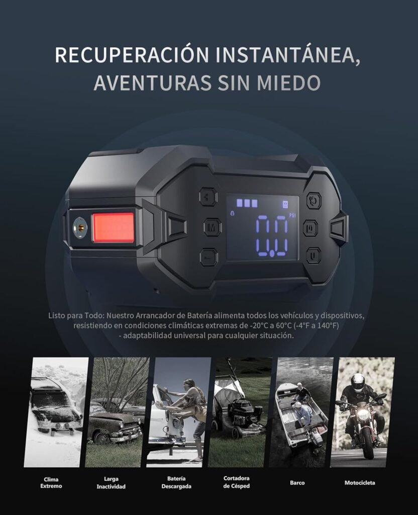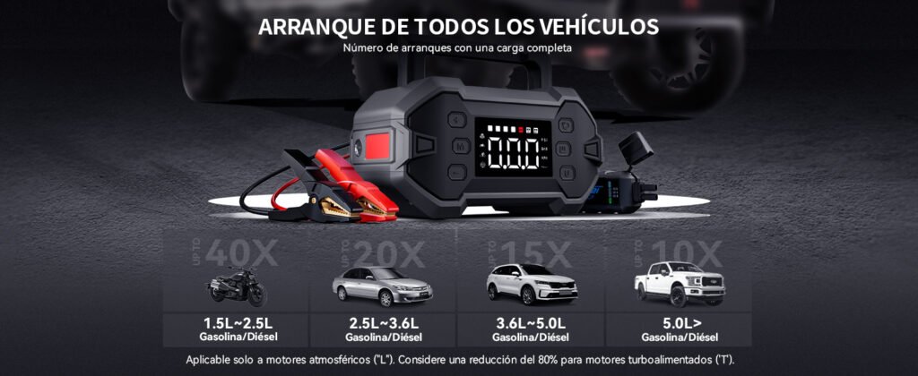 «Un arrancador potente, completo y diseñado para quienes quieren máxima seguridad en carretera. Ideal para vehículos grandes, viajes largos o usuarios que buscan una solución todo-en-uno.»