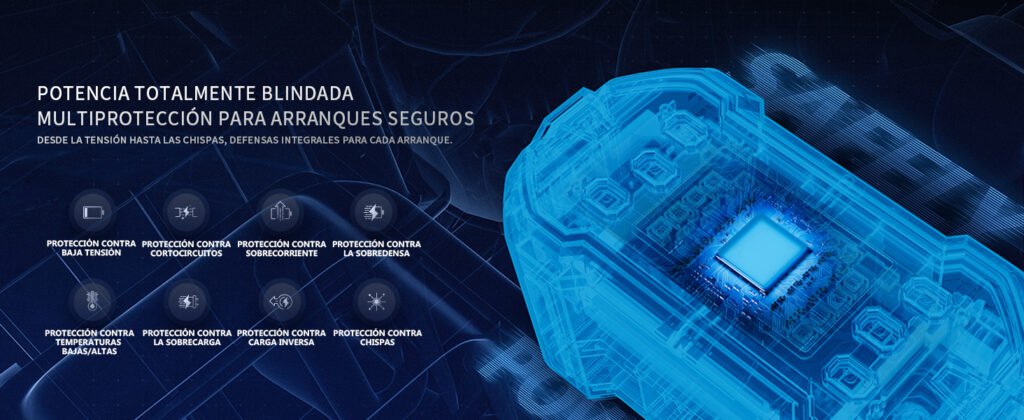 Incorpora protecciones avanzadas que actúan automáticamente. Esto hace que el arranque sea más seguro, incluso si el usuario comete errores al conectar las pinzas.