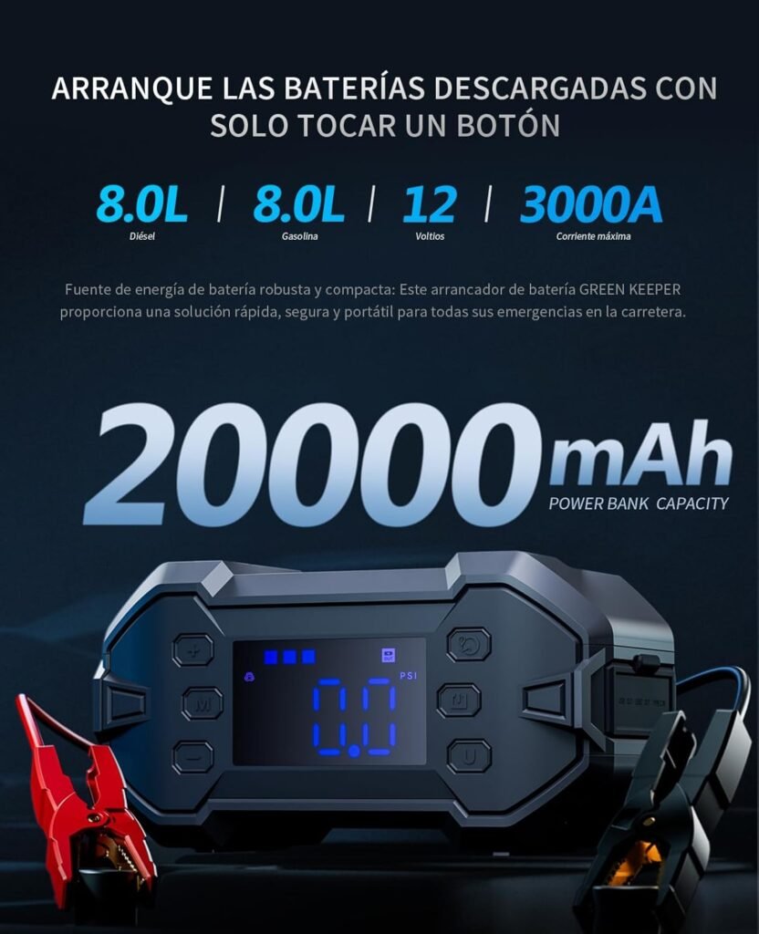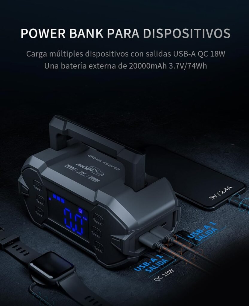 • Banco de Energía Robusto: Más que un simple arrancador, el Green Keeper también funciona como un potente banco de energí…