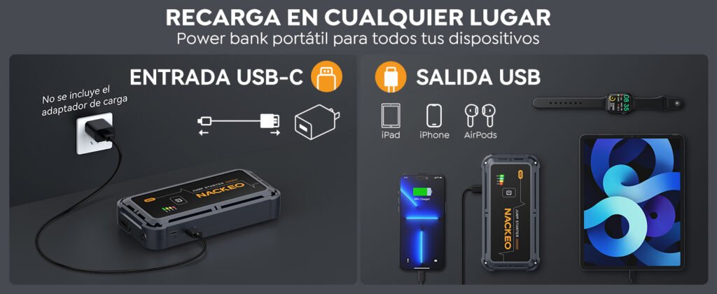 Ofrece múltiples arranques sin necesidad de recargar con frecuencia y funciona como power bank para dispositivos electrónicos en viajes o situaciones de emergencia.