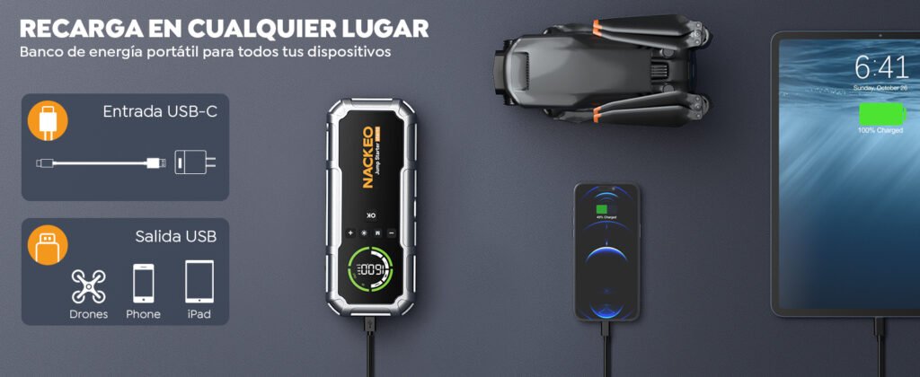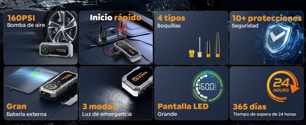 El NACKEO Star03 es mucho más que un simple arrancador de baterías. Es una herramienta pensada para darte tranquilidad, tanto en el día a día como en viajes largos, combinando potencia de arranque, compresor de aire y funciones de apoyo en un solo dispositivo compacto.