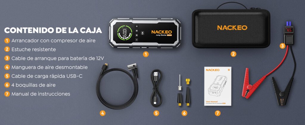 El NACKEO Star03 llega con un conjunto de accesorios bastante completo, pensado para que puedas utilizar todas sus funciones desde el primer momento sin necesidad de comprar nada adicional. El enfoque es claramente práctico: todo lo necesario para arrancar el coche, inflar neumáticos y mantener el equipo cargado viene incluido en el paquete.