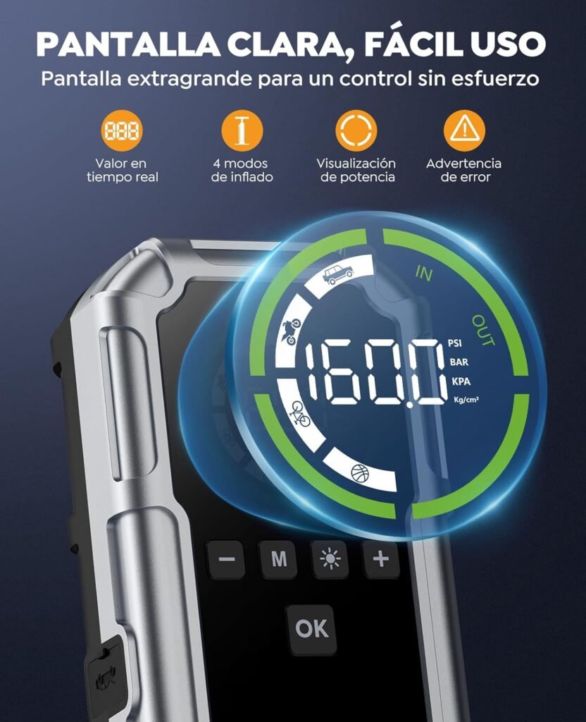 El dispositivo cuenta con una pantalla que muestra información clara sobre el estado de la batería, el proceso de inflado y otros parámetros importantes. Gracias a sus controles intuitivos, cualquier usuario puede utilizarlo sin necesidad de experiencia previa, tanto para arrancar el coche como para inflar un neumático o cargar un dispositivo.