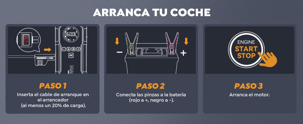 Antes de usarlo, conviene comprobar que las pinzas y los cables están en buen estado, sin signos de desgaste, suciedad o corrosión. Una buena conexión es clave tanto para un arranque eficaz como para un uso seguro.