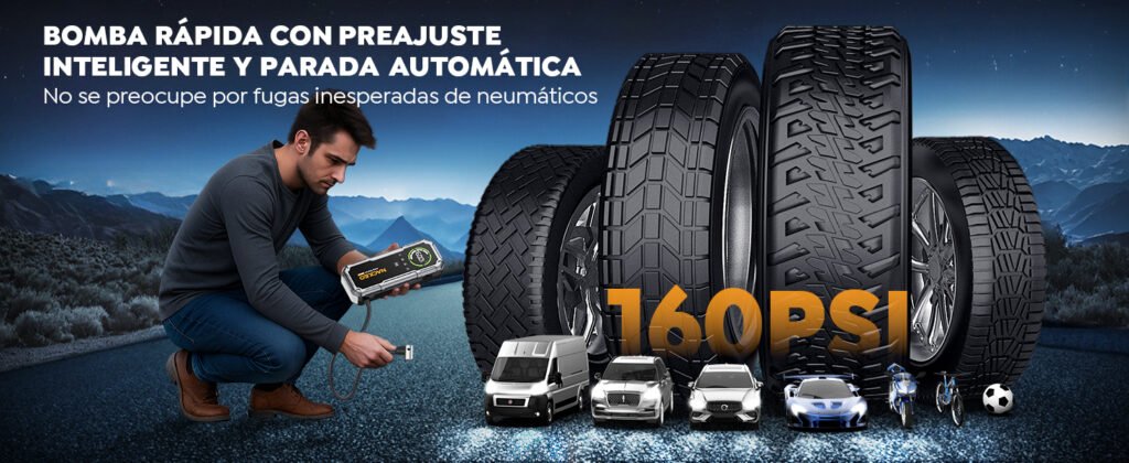 Contar con un compresor de aire incorporado y controles digitales elimina la necesidad de llevar equipos adicionales en el maletero. Inflar neumáticos de coche, moto o bicicleta es rápido y cómodo, sin depender de talleres o bombas externas.