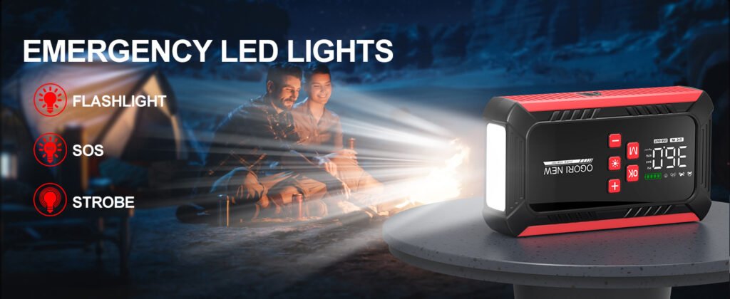 El OGORI NEW B090 también incorpora una linterna LED que resulta muy útil en situaciones con poca luz: revisar el motor de noche, señalizar el coche en caso de avería o simplemente contar con una fuente de luz adicional en viajes o actividades al aire libre.