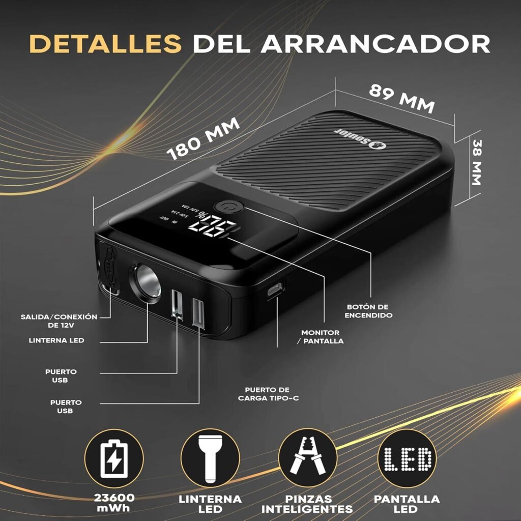 El SweetPS AC-01 es un arrancador portátil diseñado para ofrecer una solución rápida cuando la batería del coche se descarga inesperadamente. Con una potencia de hasta 8000 amperios de pico y una batería de 23.600 mAh, este dispositivo está preparado para arrancar distintos tipos de vehículos de 12 V, desde turismos hasta motocicletas, proporcionando una ayuda inmediata en situaciones de emergencia.