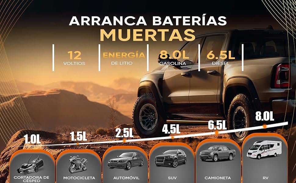 Los 8000A de pico ofrecen potencia suficiente para arrancar la mayoría de vehículos de 12 V en situaciones de batería descargada.