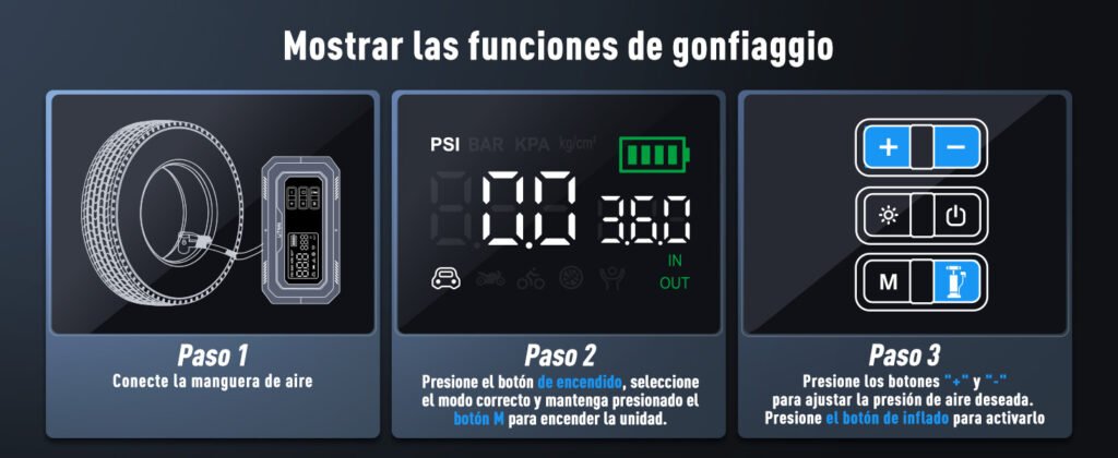 Usa los botones de la pantalla digital para ajustar el valor en PSI, BAR o KPA, según tu preferencia. - Activa el inflado automático