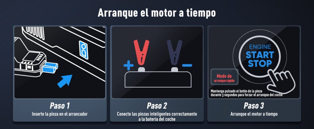 Antes del primer uso, asegúrate de que el arrancador esté completamente cargado. Puedes recargarlo mediante su puerto USB-C compatible con carga rápida de 18 W, lo que reduce el tiempo total de carga frente a modelos convencionales. - Conecta correctamente las pinzas