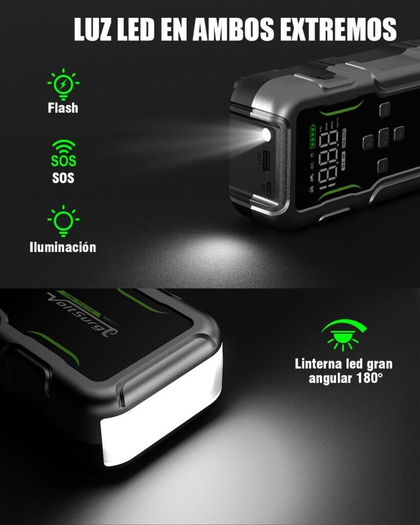 El VoltSurge D08 incorpora una linterna LED con modos de luz continua, estroboscópica y SOS. Esta función resulta indispensable en emergencias nocturnas, inspecciones rápidas del motor o para señalizar el vehículo en carretera.