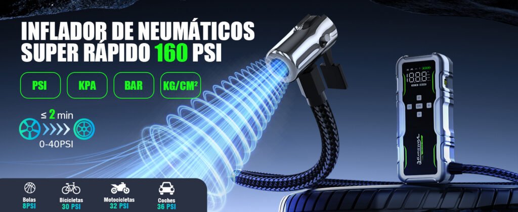 “Un arrancador completo y potente, especialmente indicados para quienes conducen vehículos grandes o buscan un equipo versátil para coche + neumáticos + emergencias.”